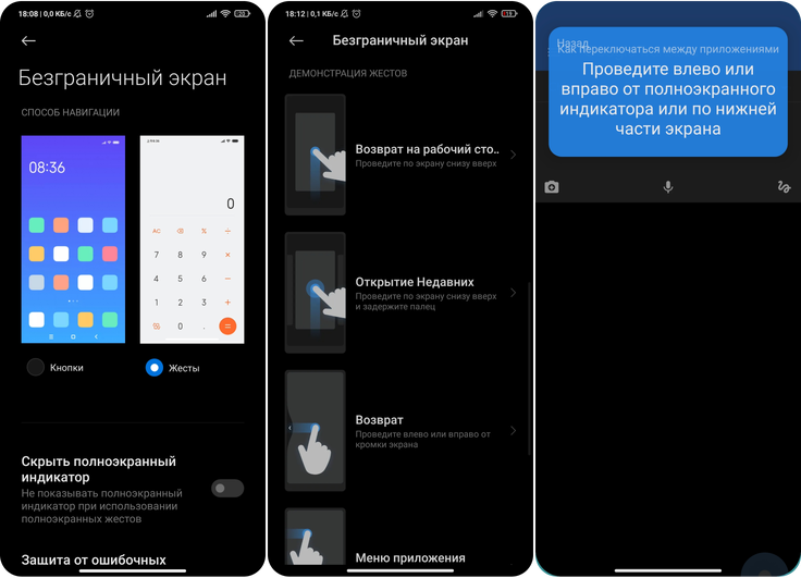 Жесты управления — удобная альтернатива кнопкам управления. MIUI 12 использует жесты от ОС Android 10. Изучить их принцип работы можно в разделе «Безграничный экран». Из новых возможностей — быстрое переключение открытых приложений, которое происходит свайпами влево/вправо в нижней части экрана. Для этого и предназначен появившийся индикатор, при необходимости его можно деактивировать.