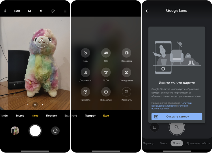Обновили и интерфейс «Камеры». Появилась вкладка «Еще», которая включает в себя дополнительные режимы съемки. Ее можно переключить в панельный режим, тогда открытие будет осуществляться свайпом вверх. Преобразились быстрый настройки, таймер и соотношение сторон изображения регулируются теперь в два клика. Вверху справа разместили иконку приложения Google Lens, которое предназначено для поиска по фото.