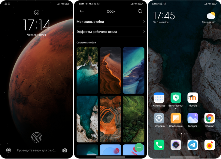 Как всегда, доступна индивидуальная настройка рабочего стола. Новшеством стали динамические обои: Земля и Марс. Активация живых обоев осуществляется в разделе «Обои». Если данная функция недоступна, то их установку можно сделать только посредством скачивания постороннего apk-файла. Еще одна интересная возможность — карусель обоев, которая порадует своим разнообразием.