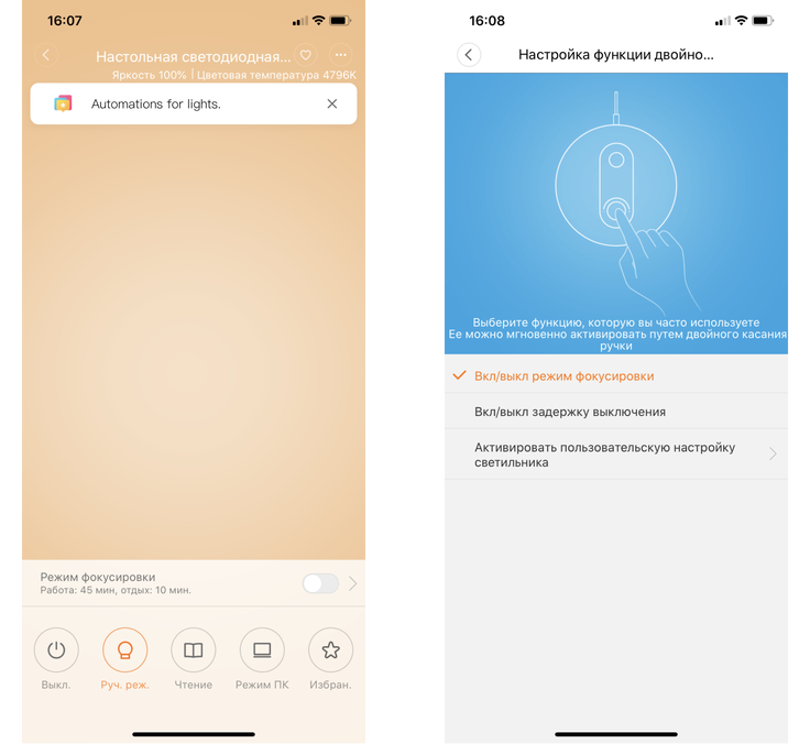 При использования фирменного приложения Mi Home функциональность устройства Сяоми немного расширяется: можно использовать в сценариях с другими устройствами умного дома, предустановленные режимы (чтение, ПК, детский), таймер выключения и настраивать функции двойного нажатия на клавишу выключения.