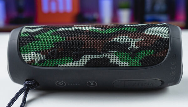 JBL Flip 4 выполнена в привычном стиле: вытянутая бочка, обтянутая тканевой сеткой. Боковые грани и часть, расположившая на себе функциональные элементы, выполнены из прорезиненного пластика. Собрано все очень качественно, без единого нюанса.