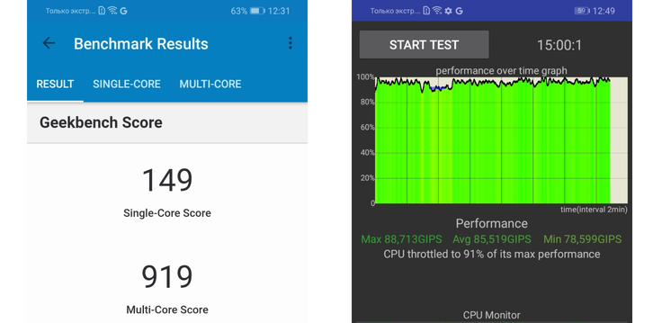 На этот раз компания Хуавей не стала использовать собственный процессор, а доверилась проверенному Snapdragon 450. Данный чипсет является представителем бюджетной линейки, но уже успел хорошо себя зарекомендовать. Объем оперативной памяти — 3 ГБ. С повседневными задачами смартфон справляет без проблем. В синтетических тестах показатели следующие: