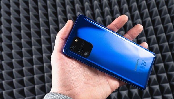 Боковые грани Galaxy S10 Lite выполнены из алюминия, а задняя крышка — из пластика, стилизованного под стекло. Цвет однородный, на солнце переливается красиво.