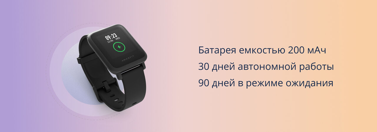 Умные часы Амазфит оснащены литий-ионным аккумулятором емкостью 200 мАч. Полный заряд батареи обеспечивает 30 дней автономной работы или 90 дней в режиме ожидания. Невероятно высокие показатели были достигнуты за счет использования технологии оптимизации энергопотребления. На зарядку устройства потребуется лишь 2 часа.