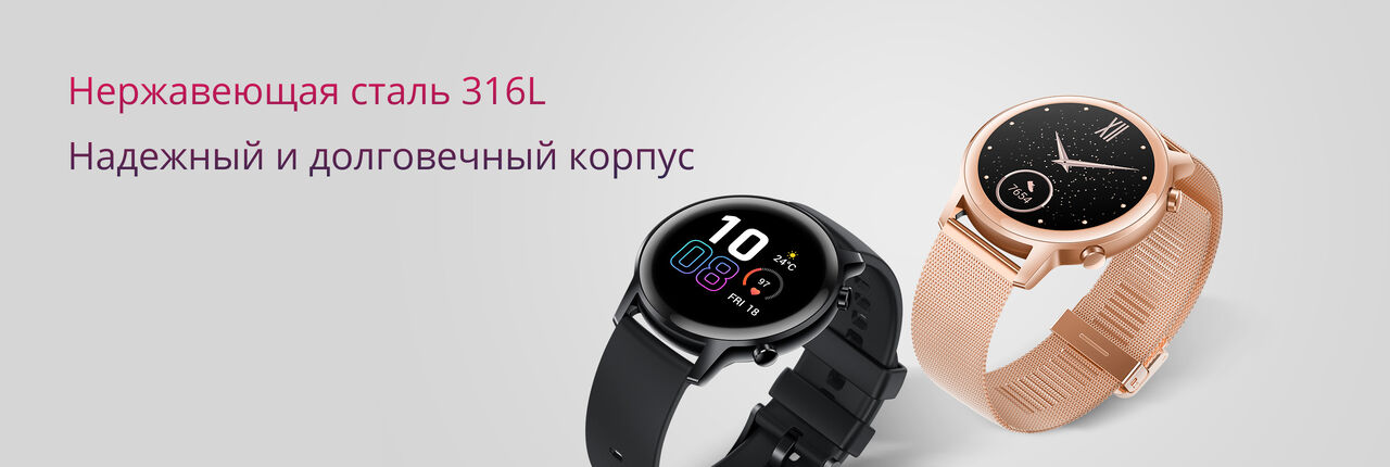 Корпус умных часов Honor Magic Watch 2 изготовлен из нержавеющей стали 316L, именно она применяется в авиационно-космической промышленности. Данный материал обладает высокой прочностью и может похвастаться небольшим весом. Диаметр циферблата — 42 мм.