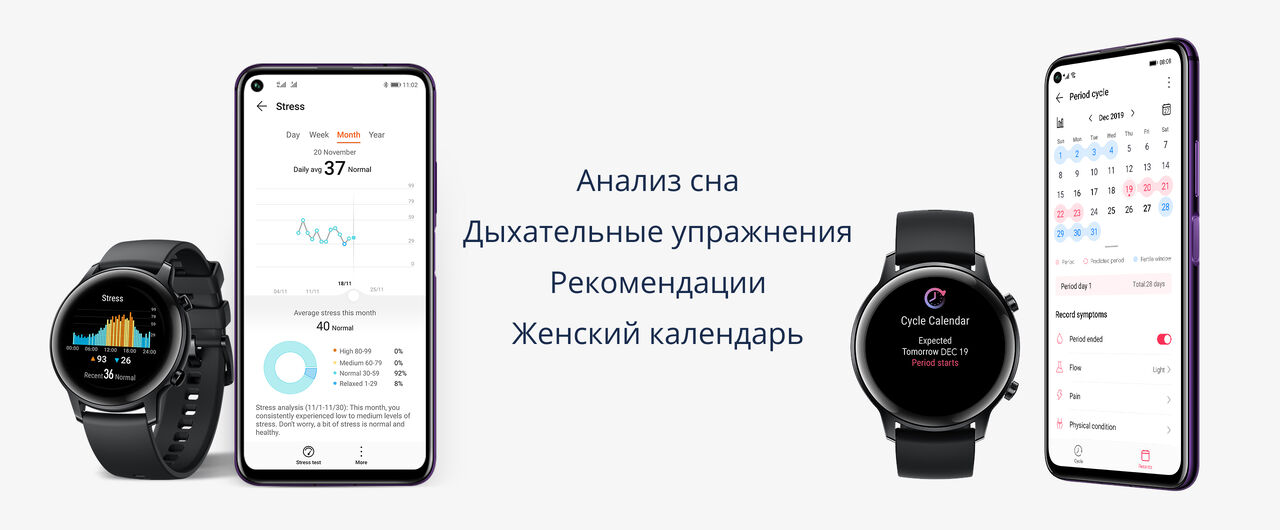 Часы используют фирменные технологии Honor TruRelax и TruSleep 2.0. Благодаря ним приложение способно предложить вам дыхательные упражнения в борьбе со стрессом и рассказать вам о фазах сна. На основе полученных данных будут сформированы личные рекомендации по улучшению сна. Также появилась новая функция «Женский календарь», которая позволит девушкам следить за своим циклом и периодами овуляции.