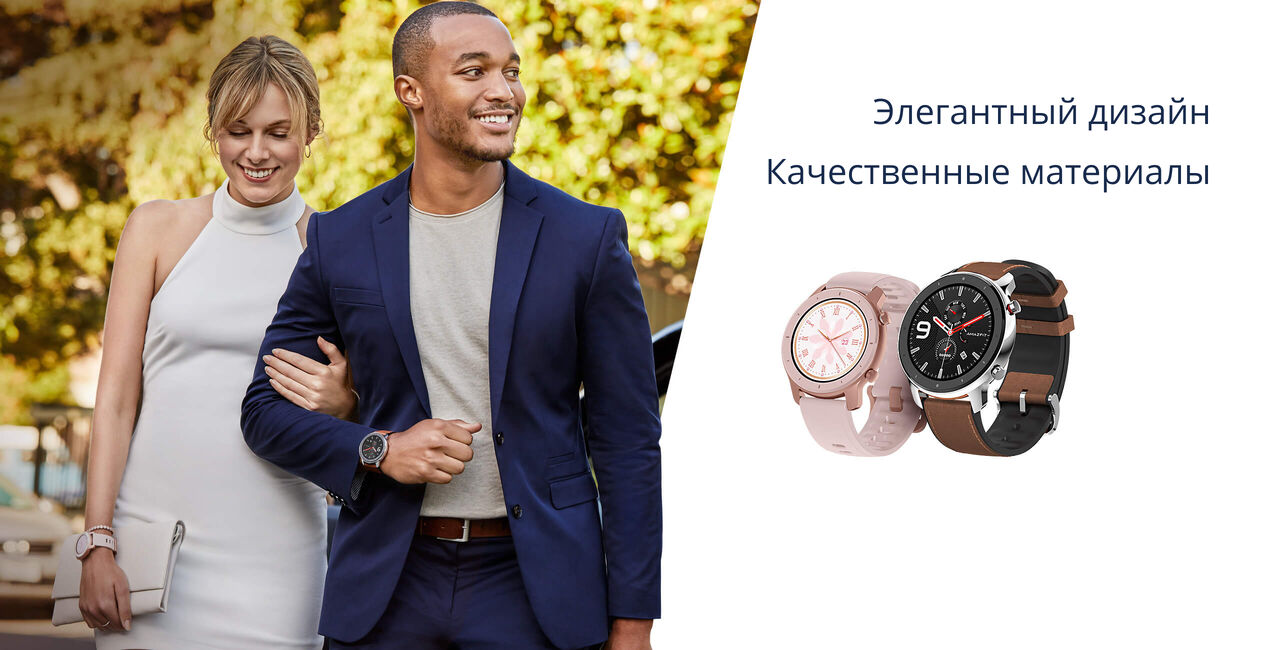 Умные часы Amazfit GTR получили великолепный дизайн, он и она смогут подобрать наиболее подходящий вариант, удовлетворяющий все потребности. Прочный и надежный корпус выполнен из металла и керамики, ремешок — из гипоаллергенного силикона либо натуральной кожи. Данная модель станет идеальным дополнением не только вечернего образа, но и во время активной тренировки.