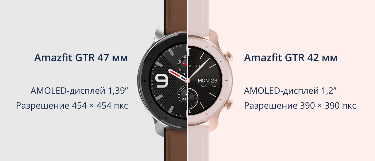Чтобы часы удобно сидели на разных запястьях, производитель подготовил 2 модели. Amazfit GTR диаметром 47 мм оснащены 1,39-дюймовым AMOLED-дисплеем, GTR 42 мм получили 1,2-дюймовый экран. В обеих моделях плотность пикселей составляет 326 точек на дюйм, за счет чего картинка яркая и четкая.