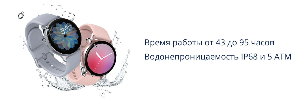 Galaxy Watch Active 2 оснащены 2-ядерным процессором с тактовой частотой 1,15 ГГц и аккумулятором емкостью 247 мАч. Время автономной работы гаджета составляет от 43 до 95 часов. Часы не придется снимать в дождь или во время плавания, ведь они защищены от влаги и пыли по стандарту IP68 и 5 АТМ.