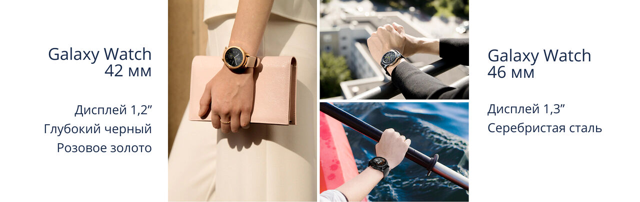 Samsung Galaxy Watch представлены в 3 вариантах: с циферблатом диаметром 42 мм в черном цвете и розового золота, а также с циферблатом 46 мм в цвете серебристой стали. Чтобы придать умным часам индивидуальности, вы можете приобрести сменный ремешок и установить наиболее понравившийся циферблат.