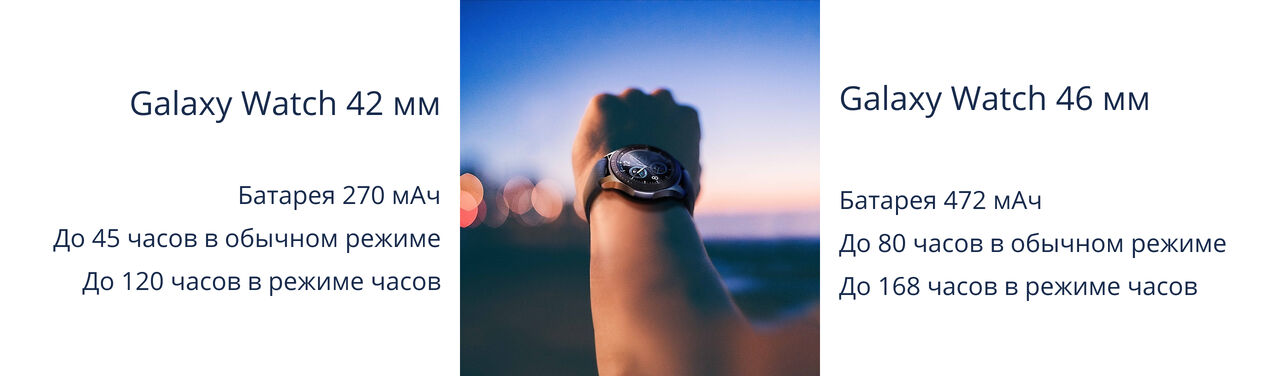 Samsung Galaxy Watch оснащены емким аккумулятором, благодаря которому часы всегда будут рядом и никогда не подведут.