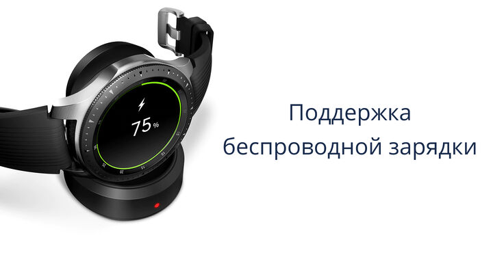Галакси Вотч имеют поддержку беспроводной зарядки. Достаточно положить часы на зарядную базу, и начнется автоматическое пополнение энергии.