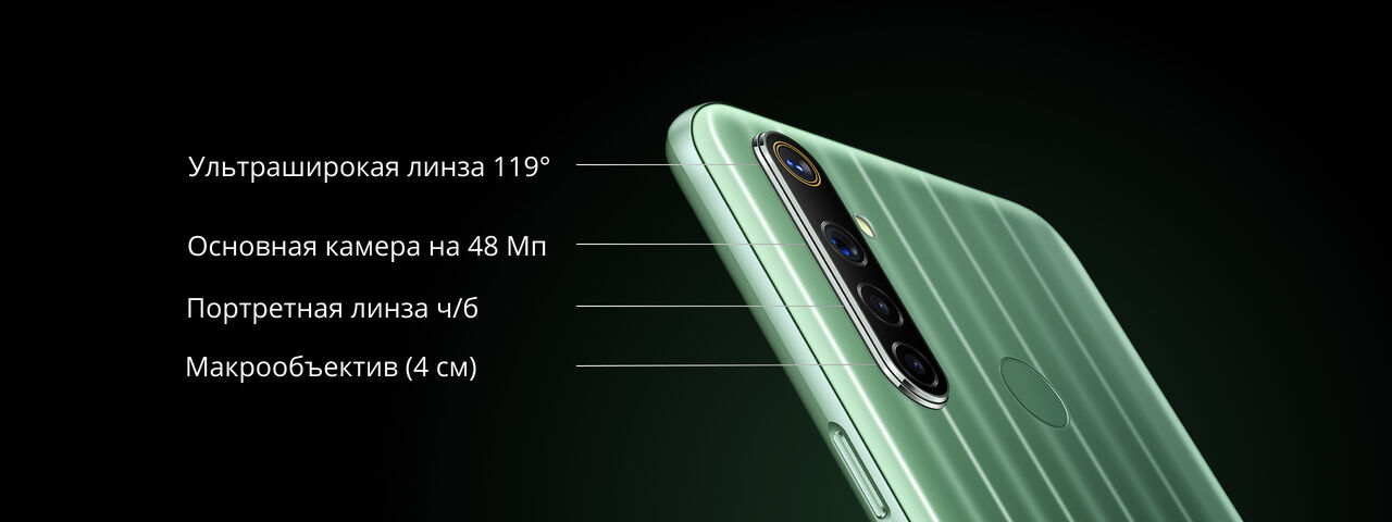 Для качественной фотосъемки Realme 6i получил квадро-модуль, состоящий из основной камеры на 48 Мп, широкоугольного сенсора с разрешением 8 Мп и углом обзора 119°, портретной линзы и макрообъектива с разрешением 2 Мп. Создавайте насыщенные и детализированные снимки с помощью основной камеры.