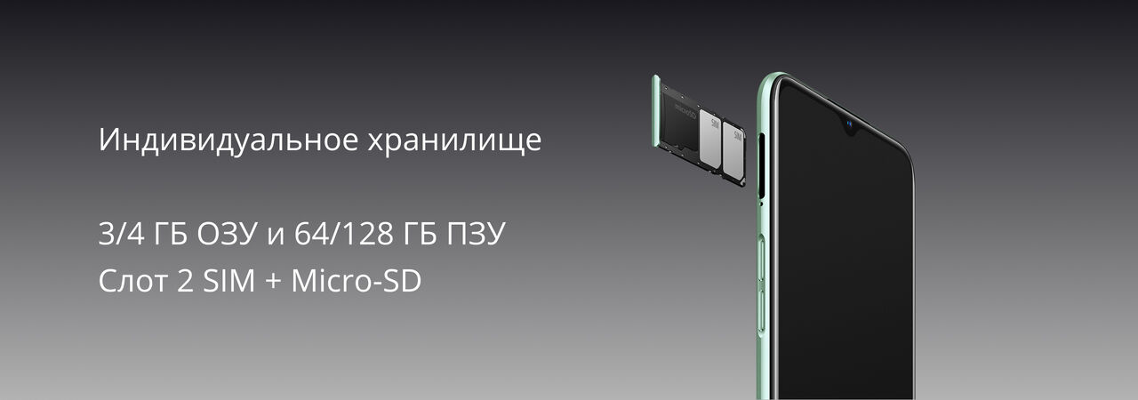Смартфон позволяет использовать 2 SIM-карты и 1 карту Micro-SD. При этом гаджет поставляется в следующих конфигурациях: 3 ГБ ОЗУ и 64 ГБ ПЗУ либо 4 ГБ ОЗУ и 128 ГБ ПЗУ. Храните на Realme 6i все, что пожелаете.