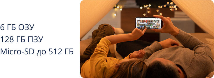 Производительный 8-ядерный процессор и 6 ГБ оперативной памяти обеспечивают плавную и быструю работу гаджета. Объем встроенной памяти внушительный и составляет 128 ГБ, что позволяет хранить в телефоне все, что дорого и важно. Если возникнет необходимость расширить место для хранения, то объем памяти можно увеличить на 512 ГБ с помощью карты Micro-SD.