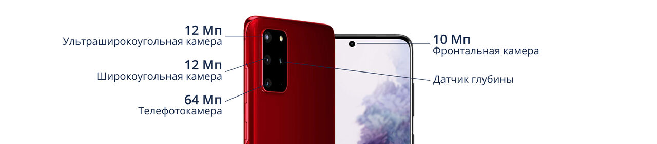 Galaxy S20 Plus получил потрясающий модуль камер. Он состоит из телеобъектива на 64 Мп, который имеет поддержку гибридного зума 3x. Цифровой зум может достигать 30x. Для съемки масштабных строений, бескрайних пейзажей или большой группы людей предусмотрен широкоугольный объектив на 12 Мп и сверхширокоугольный на 12 Мп. Дополняет эти три камеры датчик глубины, с которым ваши портретные снимки будут неотразимы.