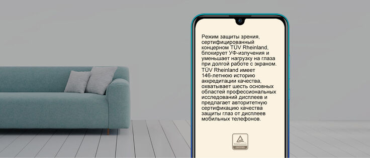 В современной жизни смартфон используется достаточно часто, поэтому очень важно следить за здоровьем глаз. Компания Huawei позаботилась о здоровье пользователей и предусмотрела систему защиты зрения, сертифицированную TÜV Rheinland. Используемая технология снижает нагрузку на галаза при долгом использовании устройства.