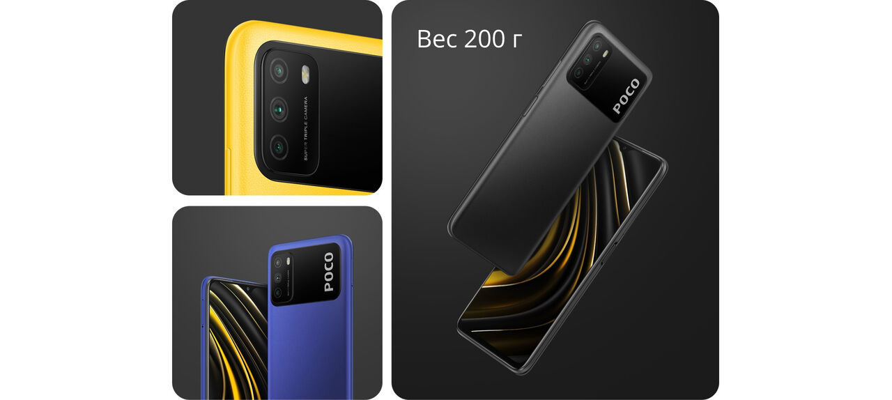 Смартфон представлен в 3 ярких цветах. Задняя панель имеет текстурированный дизайн, что позволяет забыть об отпечатках пальцев. Края Poco M3 закруглены, чтобы было комфортно держать его в руке.