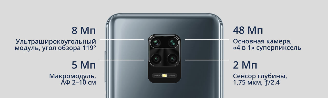 Модуль представлен сверхширокоугольным объективом на 8 Мп, основной камерой на 48 Мп, макрообъективом на 5 Мп и датчиком глубины на 2 Мп.