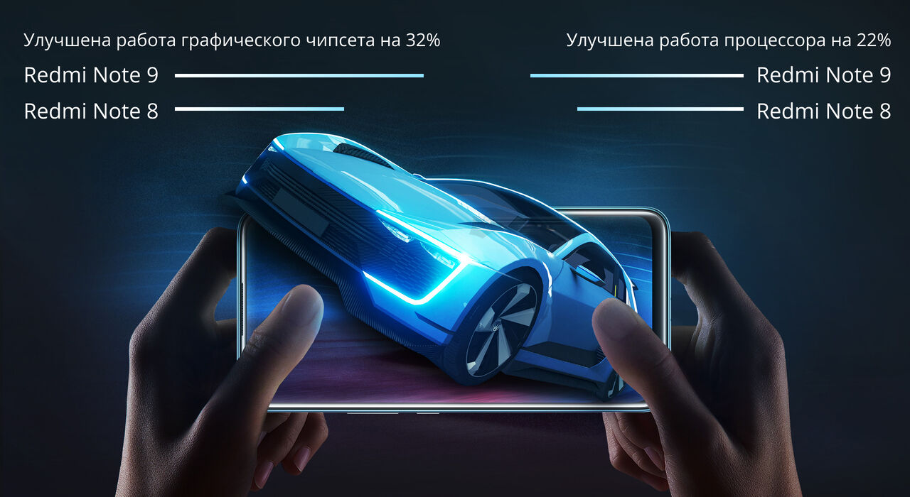 Смартфон Redmi Note 9 оснащен 8-ядерной мобильной платформой MTK Helio G85, тактовая частота которой достигает 2,0 ГГц. Чипсет дополняет графический процессор ARM G52 MC2 с частотой 1000 МГц. Помимо мощной аппаратной составляющей, гаджет поддерживает режим HyperEngine, который отвечает за быстрый и плавный игровой процесс.