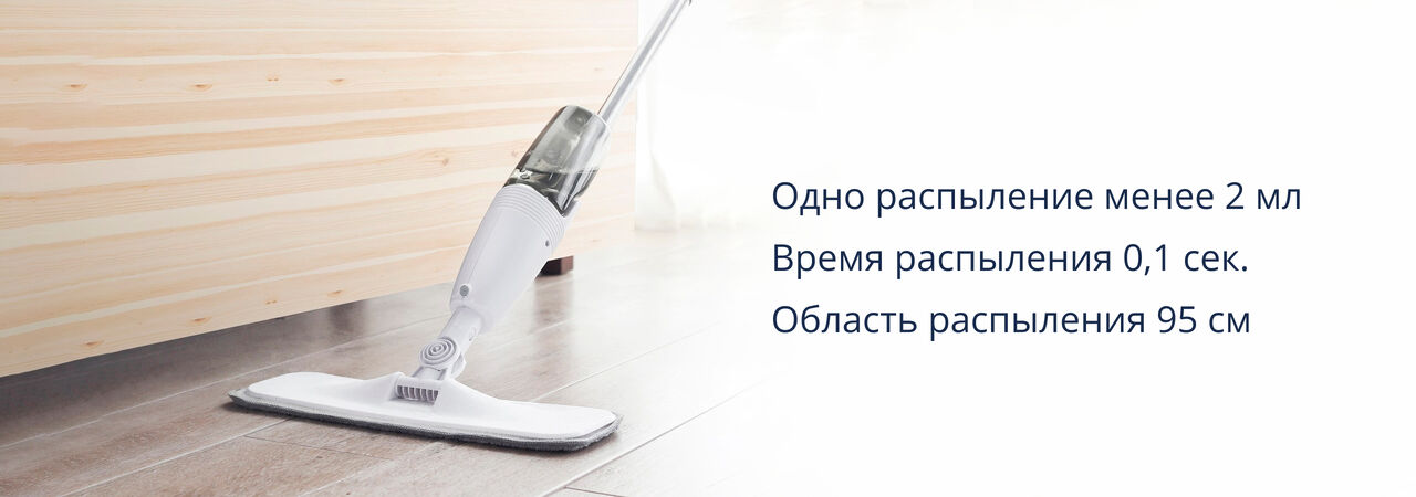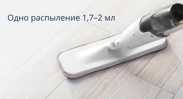 Чтобы не повредить поверхность вашего пола от избытка воды, швабра имеет экономный дозатор. За одно распыление расходуется лишь 1,7–2 мл жидкости. Затрачиваемое время на одно распыление составляет 0,1 секунды.